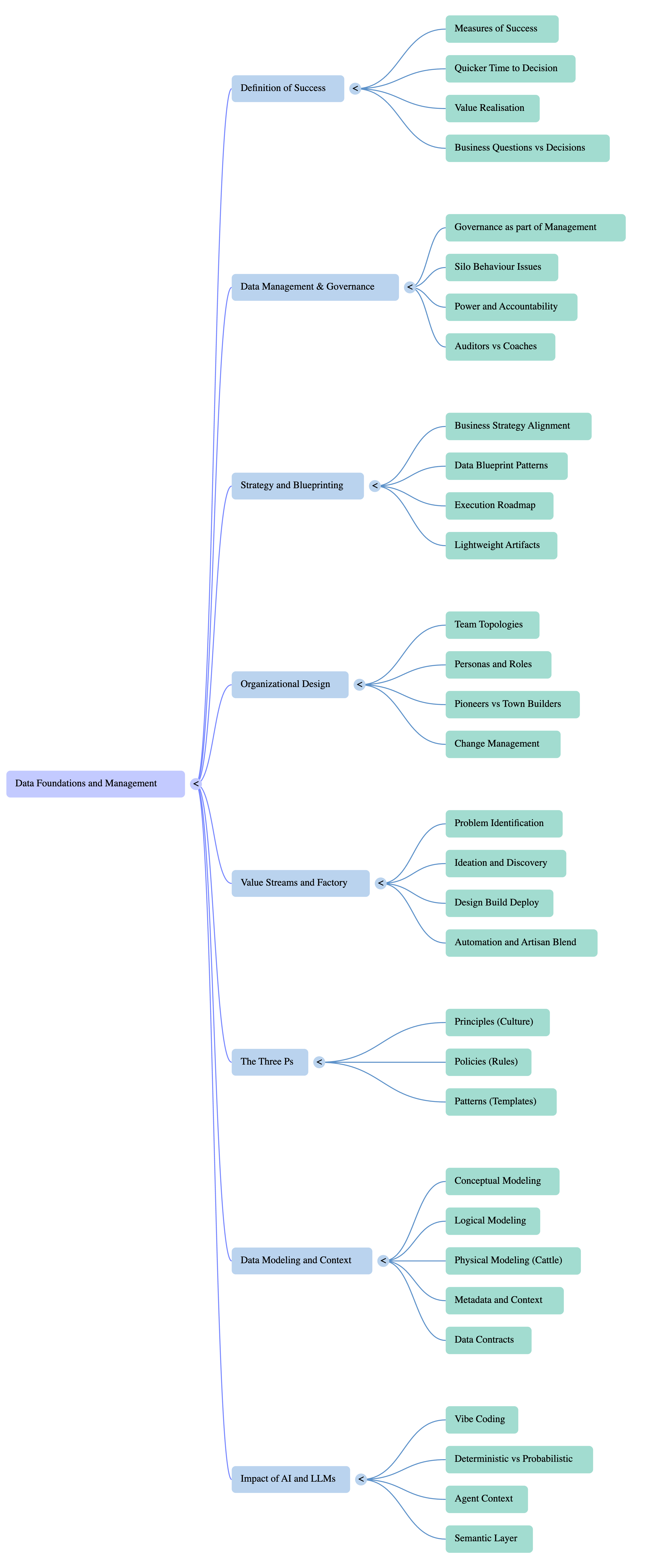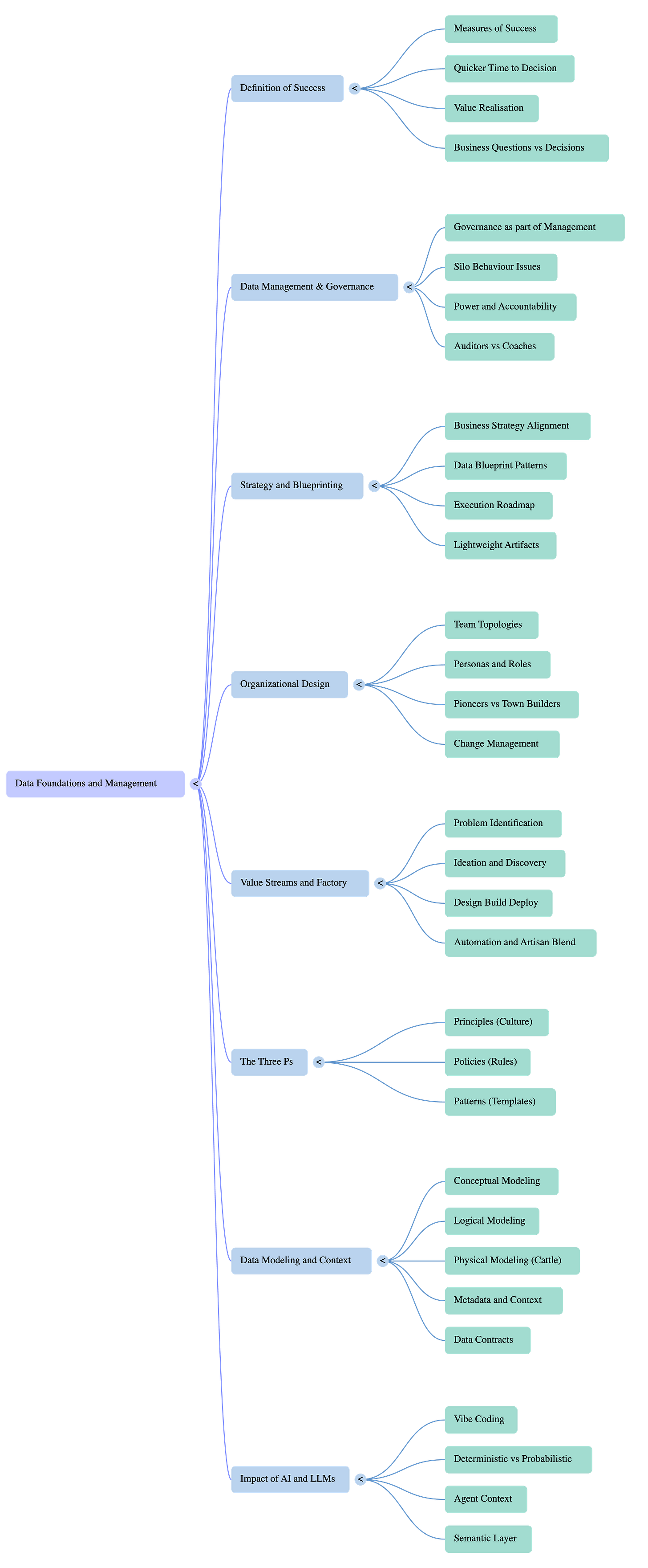 Shane: Yeah, I’m not sure I’ve solved it, but I’ve been working on it for a few decades, and I’ve got a set of what I call patterns and pattern templates. So. And kind of. I think about it like this. So my view, and it comes back to semantics, it’s all part of data management. So our foundational patterns, you know, patterns and governance, our patterns in engineering, our patterns and platform, our patterns and way of working, they all kind of, for me, come under that, that turn data management. And the reason I say that is I don’t like this idea that there’s a separate data governance group. And a separate data team. That silo behavior causes us massive problems. And so for me, it’s, it’s all within the same way of working. We may organizationally have our data team structures slightly different where, you know, people are focused and for scaling reasons and separate pods or groups. But I think governance is part of management. Yeah. And if we’re not governing our data, then we’re not managing it. So that, so that’s the first thing. If I kind of look at it from that lens, and then I look at. Kind of subdomains within data management, you know, we have ones which are around architecture and platform. And so when people say foundation. What I typically hear them talking about is technology foundations. You know, I need cloud analytics database. So I need an ETL tool. And what often happens in an organization is I’ll, I’ll get asked to come in and do some work with them either on a greenfields environment where they’re starting from scratch again. Or they haven’t had a data management capability or platform before. Or a brownfields one where they come in and ask me to do an architecture review. And as an ex technologist, my natural reaction is to get into the technology, right? Oh, that’s what they’ve asked me to do. Come in and look at our architecture, look at our platform, look at our tooling. And what I’ve learned over the decades of doing this is we need to step back and we need to look at some other things as well. We need to look at our way of working. We need to look at what our strategy, our team designers. And so over the years, I’ve kind of been building out this data blueprint template and set of patterns that I use. And what I’ve learned is the first foundational question that I always ask now, regardless of it’s greenfields or it’s brownfields or why I’m being bought in is what is the definition of success? Yeah. So if we’re going to spend this money, right, in terms of tooling and technology and people and change, and even if we’re using open source, let’s not. It’s not tell ourselves it’s free, right? Yes, there may not be a license cost upfront. But the five data people are going to cost you a million dollars in salary for a year if you’re in the US. Right. So there is a cost there. So let’s say we spent that year. We delivered everything we promised. Yeah, we made the changes that we needed to make. What’s the measures of success? Like what’s actually going to happen? And for me, I want to keep them really simple. For me, they’re just up arrows or down arrows. And I’m looking for things like, you know, when I often hear, we want self service. I’m like, well, that’s not a measure of success, right? That’s just a tool. It’s a pattern. So what does that give you? Oh, actually, we get quicker time to decision. Ah, okay. Right. So now what you’re saying is the time taken to make decisions in the organization based on data reduces right down arrow. Good. Or we, we don’t need to talk to the data team. Yeah, cool. That’s, that’s a process thing. What’s the measure of success? Oh, again, we can make decisions quicker. Okay, so we’re still back on that down arrow. Or how do we want to measure we’re successful with that? Okay, well, the number of requests going to the data team is reduced. Yeah. Or maybe we say, actually, it’s not self service is not the tool we’re going to use to deliver that measure of success. Maybe the data team are just going to get better and faster answering questions. Yeah. So the time to decision still goes down. But the tool we use, the thing we measure is how quickly the data team respond and answer that question. Yeah. And that should go up, right? We should be faster and faster. Yeah. Less time or more questions answered. And so that’s the first foundational piece I always think an organization should do. If we make this investment, what actually changes in our organization? What are the measure of success? What are the indicators, the arrows that are even going to go up or down that we can then prove that that investment was worth it? And I see lots of people not doing that foundational piece. What have you seen?