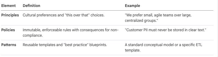 Shane: And I kind of think I have a set of patterns now, but I’m just testing them. And it’s one I’ve struggled with for decades, right? Because it comes back to this idea of building the plane while you’re flying it, right? Like how much of the plane needs to exist. And experimented for years around this and never really got traction. And so the framing of the pattern that I have in my head right now is this idea of pioneers and town builders. And you need to decide which of those two patterns is your organizational culture. And that is a decision that you need to make upfront. Because that frames everything else. Now everything else is just a lego block, right? It’s a pattern. It’s a patent template. I’m doing lots of work on those at the moment. For a whole reason. I mean, we could talk about in a minute around why I think templates actually help solve the problem that we had, which is we lost a lot of our domain expertise when, when we went to democratization, when we bought more people into our domain to do the work that we used to do as experts. We lost the education, we lost the training. And that was a bad thing, but it was also a good thing. So I think we have to teach people to do the work we used to do. And ways that had value. Maybe not the ways we used to do them, but in the same pattern they had value. Like data design, right? We should always do a light data design because it is a valuable thing, but we don’t need to spend six months doing enterprise data model anymore. So I think these patent templates are actually the unlock to teach people to do what we’ve got taught over decades to do. But I’ll go back to pioneers and town builders. So are we going to go out and experiment. Heavily. Find things at work? Buy things that don’t, and then start codifying those into our town. And build the town after we’ve pioneered the settlements. Is that our culture? Or do we want to actually build the town? And then get people to come and live in it? Right. Is that our culture? Now, when we build the town again, we can’t spend two years building the town before we let them come, right? So we’ve still got to do it and they’re iterative and a way that has agility. So let’s say that that’s a culture decision. And it’s an important one. And then what I can go back to is I can take that decision that organization has done and I can look at our team design, our measure success, our value stream and our data factory processes that we think we’re going to run with and go, well, you told me that you’re going to be pioneers and yet I see heavy team design, heavy value stream processes, right? So you actually, that’s not your culture. Like one of those two things is out of sync and we need to fix it. And so then, okay, let’s say that we pioneer all we town builders. The key thing is we have to think about principles, policies and patterns. Those are the three P’s that I use. And so again to anchor my language. A principle is like a culture thing. It’s like an agile minute based to us. We prefer this over that. We prefer small teams of three over big teams of 10. Yeah, we prefer delivering value earlier, even though it’s riskier. Than waiting three months and delivering value later than as higher quality. Or we prefer delivering value later with high quality over early with high risk. They’re just principal decisions that we want to make. And they set the culture of the team and the way the organization works with data. Policies for me are immutable rules. They are things we will get fired for. Yeah. So you should never store a customer’s name date of birth and passport number and clear text. Right. That is a policy. But we have to enforce that policy. So if I ever see a customer name date of birth and passport number in an excel spreadsheet. Then we’ve broken that policy. And the person who’s done that. Should be. Censured or fired. Right. And what happens though is when we talk about data foundations and especially data governance, we treat policies as wishes. And I’ve done it, right? I used to write these principle and policy documents that were massive and they were kind of rules, but they either got fired. You know, I work for a bank and they had all these policies. And yet I saw them posting a customer’s name. Their account number and their last transaction in a teams chat because that was the, yep, because that was the only way that team could solve the problem for that customer at the right time. And so they were breaking the policy. Now, the reason they broke the policy was because no other system was in place that let them solve the problems and they had to solve it. So they solved it with the tools they had. But what we should be saying is that team’s breaking the policy. What do we need to do to change what that team’s doing? So they actually don’t break the rules? Yeah. So policy is very small targeted set of rules. Like you said, the police state, you know, police things, you know, you, you can’t drive a car at 200ks an hour past a school road, you know, during school time or you will be locked up in prison, right? Quite rightly. Um, so that’s there. And then patterns are all the other things that are useful. Yeah. They typically what I see people write policies as if you do this, it’s valuable. If you do this, it’s useful. You should kind of do that. And that’s what I look at those three P’s principles, things we should subscribe to this versus that policies rules that I’ll get fired if I actually break them. And so I’ll come back to that. If we say that that’s the rule, then we even need to automate detection of when we break the policy. Or have auditors in our organization that will go out and audit that those policies aren’t being broken. If you don’t enforce a policy, then actually it’s not a rule, right? It’s a wish. And then patterns, what we should do is have people that share their p